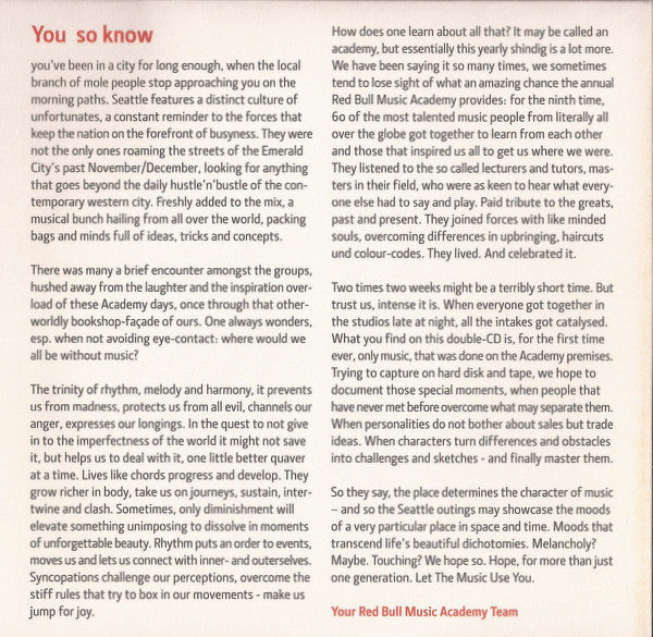 A compilation of songs recorded at the 2005 session of the Red Bull Music Academy in Seattle, WA.