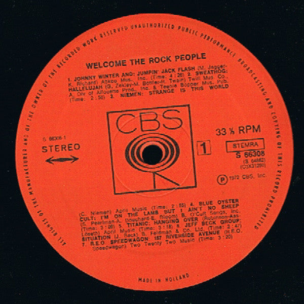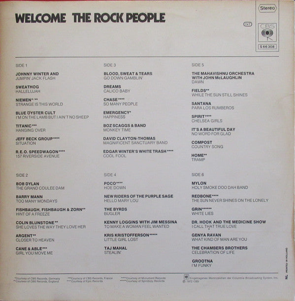 A1. Johnny Winter And - Jumpin' Jack Flash 4:26 A2. Sweathog - Hallelujah 2:58 A3. Czesław Niemen - Strange Is This World 2:55 A4. Blue Öyster Cult - I'm On The Lamb But I Ain't No Sheep 3:05 A5. Titanic (3) - Hanging Over 3:18 A6. Jeff Beck Group - Situation 2:47 A7. Reo Speedwagon - 157 Riverside Avenue 3:20 B1. Bob Dylan - The Grand Coulee Dam 3:00 B2. Barry Mann - Too Many Mondays 3:55 B3. Fishbaugh, Fishbaugh & Zorn - Hint Of A Freeze 2:57 B4. Colin Blunstone - She Loves The Way They Love Her 2:49 B5. Argent - Closer To Heaven 3:30 B6. Cane And Able - Girl You Move Me 3:00 C1. Blood, Sweat And Tears - Go Down Gamblin' 4:14 C2. Dreams (4) - Calico Baby 3:19 C3. Chase (5) - So Many People 2:42 C4. Emergency (6) - Happiness 4:29 C5. Boz Scaggs & Band - Monkey Time 3:00 C6. David Clayton-Thomas - Magnificent Sanctuary Band 3:30 C7. Edgar Winter's White Trash - Cool Fool 3:02 D1. Poco (3) - Hoe Down 2:05 D2. New Riders Of The Purple Sage - Hello Mary Lou 2:58 D3. The Byrds - Bugler 3:07 D4. Loggins And Messina - To Make A Woman Feel Wanted 2:45 D5. Kris Kristofferson - Little Girl Lost 3:08 D6. Taj Mahal - Stealin' 7:00 E1. Mahavishnu Orchestra, John McLaughlin - Dawn 5:15 E2. Fields (3) - While The Sun Still Shines 2:04 E3. Santana - Para Los Rumberos 2:44 E4. Spirit (8) - Chelsea Girls 3:27 E5. It's A Beautiful Day - No Word For Glad 3:05 E6. Compost (2) - Country Song 2:31 E7. Home (2) - Tramp 3:30 F1. Mylon - Holy Smoke Doo Dah Band 4:07 F2. Redbone - The Sun Never Shines On The Lonely 2:32 F3. Grin - White Lies 3:26 F4. Dr. Hook & The Medicine Show - I Call That True Love 2:59 F5. Genya Ravan - What Kind Of Man Are You 3:26 F6. The Chambers Brothers - Celebrations Of Life 3:25 F7. Grootna - I'm Funky 5:29