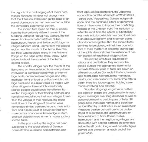 Recorded in 1976 in the villages of Borai, Bo'da, Kaean, Kuluguma, Nibia-Sissimungum and Damaindeh-Bau in Papua New Guinea.