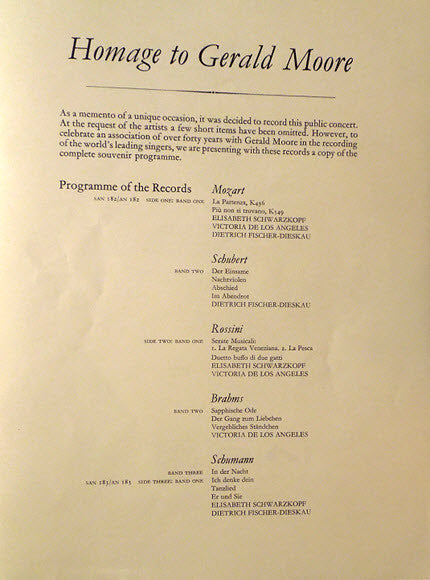 Includes a 24 page booklet, 30cm X 21 cm (12" x 8"), with the Tracklist and also "notes and appropriate texts from the souvenir programme". It contains Librettos and an "Homage in Words" from each of the artists and a number of other Colleagues.