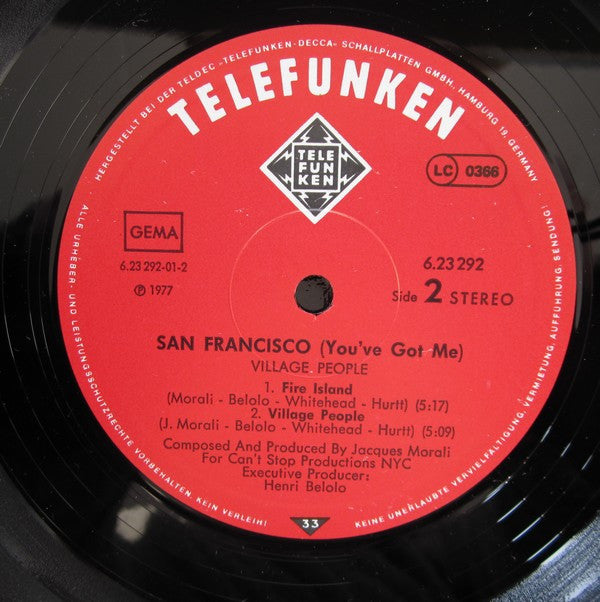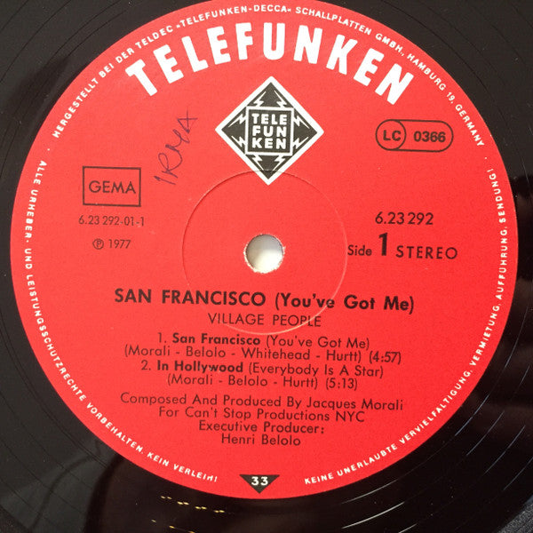 Title on Sleeve and Spine: "Village People" Title on Disc: "San Francisco (You've Got Me)" Composed & produced for Can't Stop Productions NYC. Recorded at Sigma Sound Studios NYC. Labels & sleeve have different durations, the sleeve says: 5:54, 5:13, 5:38, 5:29 Made in Germany - TELDEC »Telefunken-Decca« Schallplatten-GmbH.