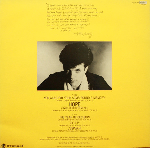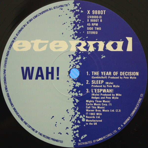 Back cover incorrectly lists secondary catalogue number as (249879-0) with embossed WEA logo below it. Initial copies came with a free poster (and a sticker on the front). Publishers: A1: Virgin Music Publishers Ltd. A2, B2, B3: Call This Music/ Warner Bros. Music Ltd. B1: Mighty Three Music (P) 1983 WEA Records Ltd. Sleeve credits both Pete Wylie and Mike Hedges as producers for all tracks (Mike Hedges having the first credit on Hope and L'Espawah! only). Labels credit Pete Wylie as sole producer for the other 3 tracks.