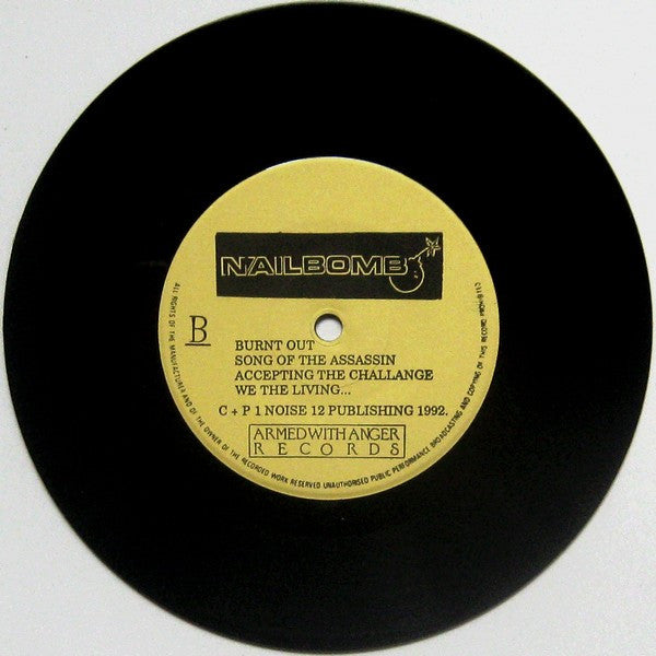 The complete item has a fold out picture cover with a special cut corners (x 2) die-cut paper inner and came with a very small Nailbomb sticker and a folded lyrics insert