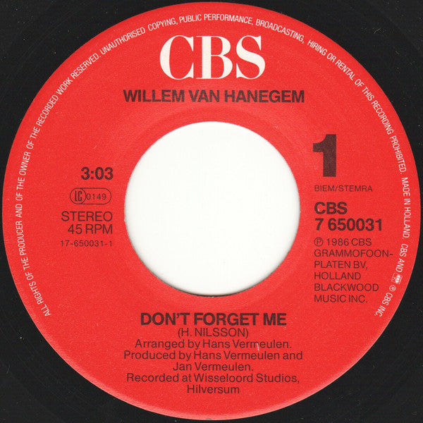 Willem van Hanegem - Don't Forget Me (7", Single)