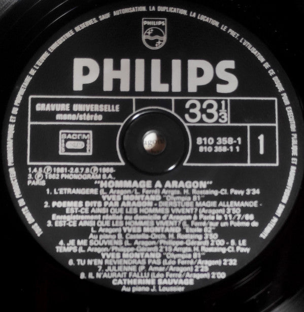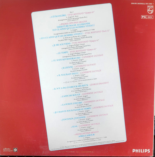 A1. Yves Montand - L'étrangère A2. Louis Aragon - Poemes Dits Par Aragon: Dierstube Magie Allemande, Est-ce Ainsi Que Les Hommes Vivent? A3. Yves Montand - Est-ce Ainsi Que Les Hommes Vivent A4. Yves Montand - Je Me Souviens A5. Yves Montand - Le Temps A6. Catherine Sauvage - Tu N'en Reviendras Pas A7. Catherine Sauvage - Julienne A8. Catherine Sauvage - Il N'aurait Fallu B1. Georges Brassens - Il N'y A Pas D'amour Heureux B2. Catherine Sauvage - L'affiche Rouge B3. Catherine Sauvage - la Porte D'elvire B4. Catherine Sauvage - Je Chante Pour Passer Le Temps B5. Catherine Sauvage - J'entends, J'entends B6. Catherine Sauvage - Elsa B7. Louis Aragon - Poème Dit Par Aragon: Après L'amour