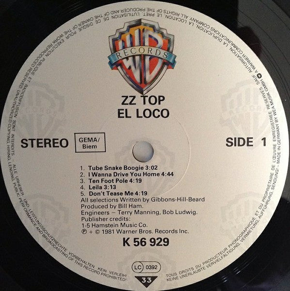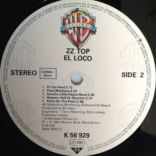 OIS = Generic White + Leaflet advertizing other LPs of ZZ Top showing 9 Cover photos.